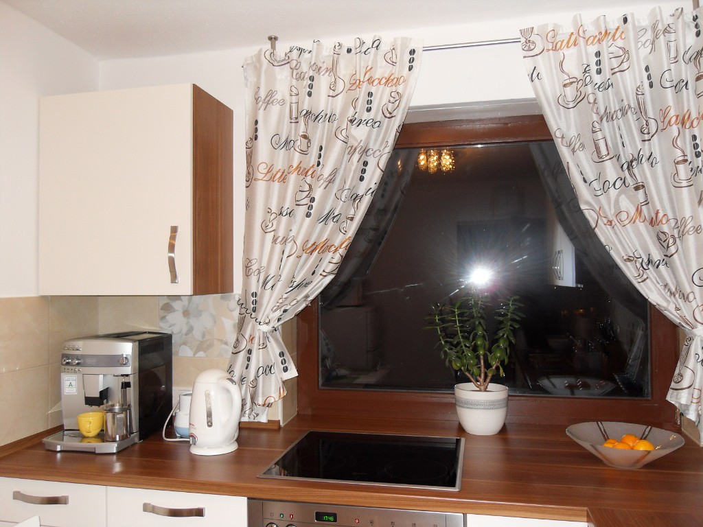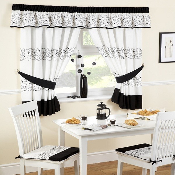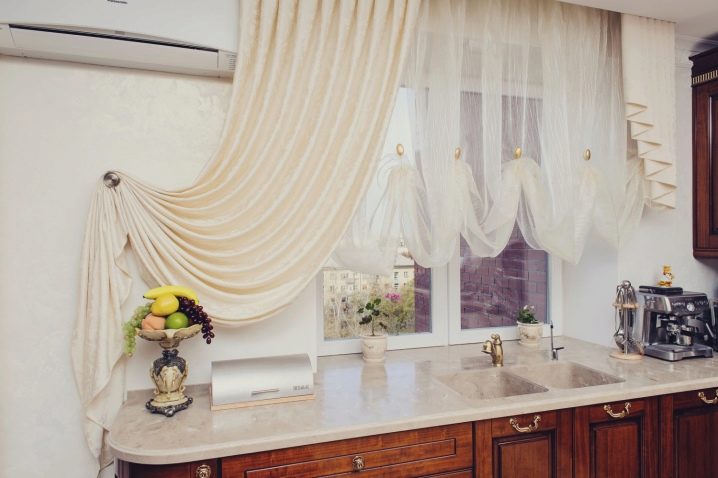 Гардина короткого покроя станет центром интерьера кухни, если вы исполните её с подхватом на одну сторону.