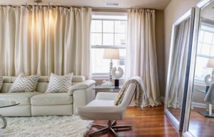 - Полотно «в пол» – самый выгодный и популярный вариант для квартир. Занавески расположеные на расстоянии 1–1,5 см от пола, визуально создавая впечатление упора в пол, если покрытие не ровное, это необходимо учитывать при замерах. В этом случае можно скорректировать недостаток неровности пола. Ткань используется с запасом или ровно по расстоянию от стены до стены. При наличии натяжного потолка, нюанс состоит в расположении гардины – она может быть спрятана под потолком (тогда ткань необходимо брать с запасом) или ниже потолка;