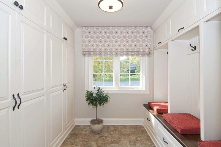 Идеальная прихожая в частном доме с окном, оформленным римской шторой с оригинальным принтом, очень удобная и функциональная. Места хранения изобилуют ящичками и вешалками, а наличие окна в светлых тонах добавляет очарования и стилевое единство.