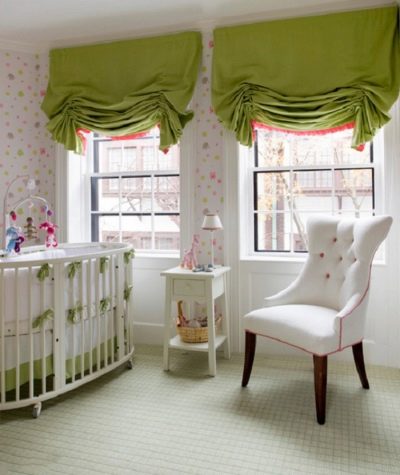 Лондонские шторы в детской для малыша выполнены из двухсторонней ткани благородного зеленого и бордового цветов. Они контрастируют с нежным светлым интерьером и придают загадочность и покой.