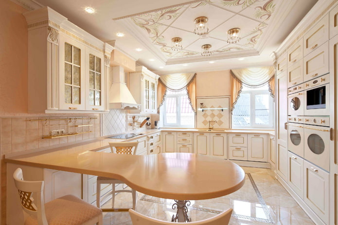 Это шикарные гардины, большое количество складок, оборок. Другой вариант — простые, шторы без складок, возможно портьеры. Такие занавески вешают на деревянные гардины, кольца, крючки, металлические трубы. В таком стиле выполняются, как правило, длинные шторы. Но классическая тюль-арка, австрийская шторка, подвернутая на одну сторону, в коротком варианте смотрятся великолепно.