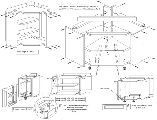 - Чертежей с деталировкой всех элементов, с указанием мест крепления деталей, типов отверстий и используемой фурнитуры, расположения кромок.