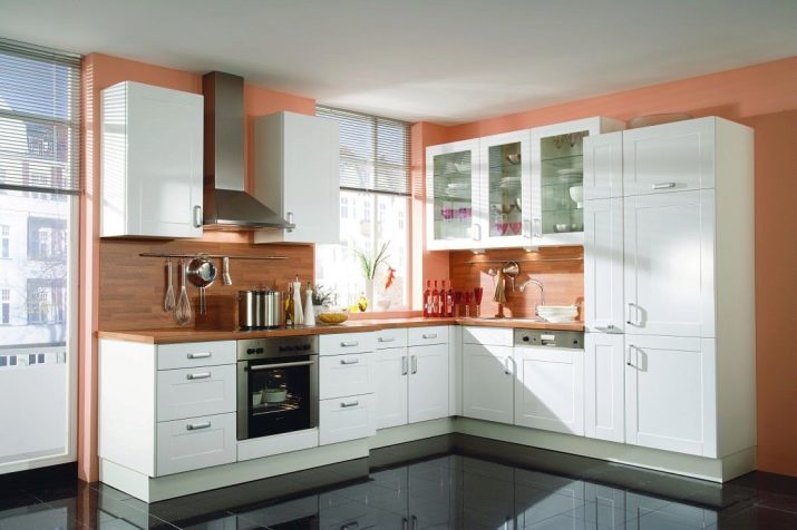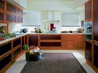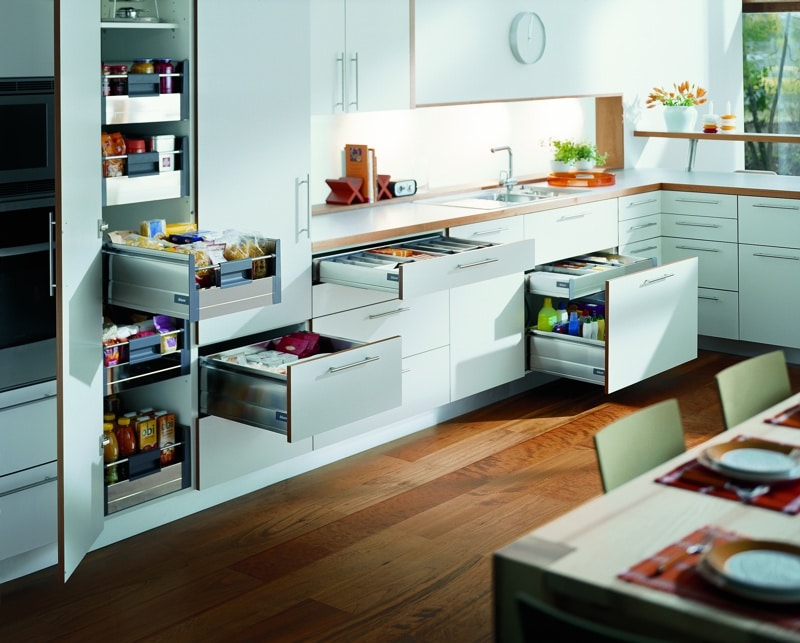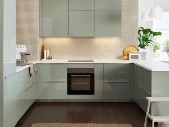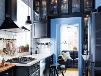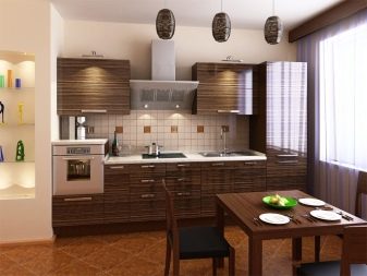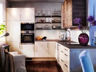 Чаще всего при планировке жилых помещений комнате для приготовления и приема пищи отводится немного места. В современных домах – в среднем от 10 м² до 15 м². С учетом этого шкафы имеют свои особенности, например, линейные модели занимают площадь от стены до стены, а угловые тянутся вдоль двух смежных стен. Существуют варианты в виде буквы П — объемные системы хранения с огромным количеством полочек, ящичков и выдвижных модулей.