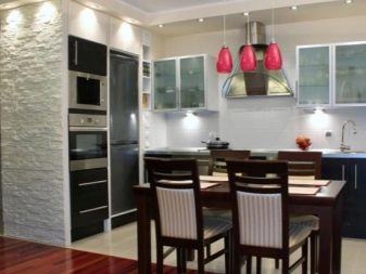 В связи с экономией пространства распространена практичная встроенная мебель, занимающая гораздо меньше места, чем отдельно стоящая. Наряду с интерьерными предметами встраивают и техническое оборудование – варочные поверхности, духовые шкафы, микроволновые печи, стиральные и посудомоечные машины, холодильники.