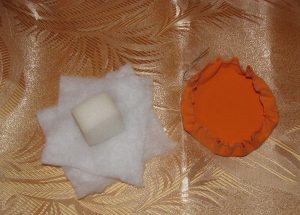 Швом «вперед иголку» прошивают круг по краю с отступом 0,5 см, немного стягивают края. Обрезки мебельного поролона оборачивают синтепоном, чтобы не было выступов. |