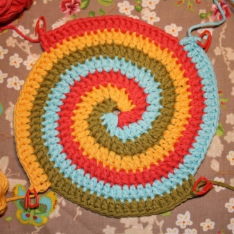 Из мотивов. Для создания коврика сначала вяжут отдельные элементы любой формы (круги, ромбы, квадраты, треугольники) из разной пряжи, а затем соединяют вместе.
