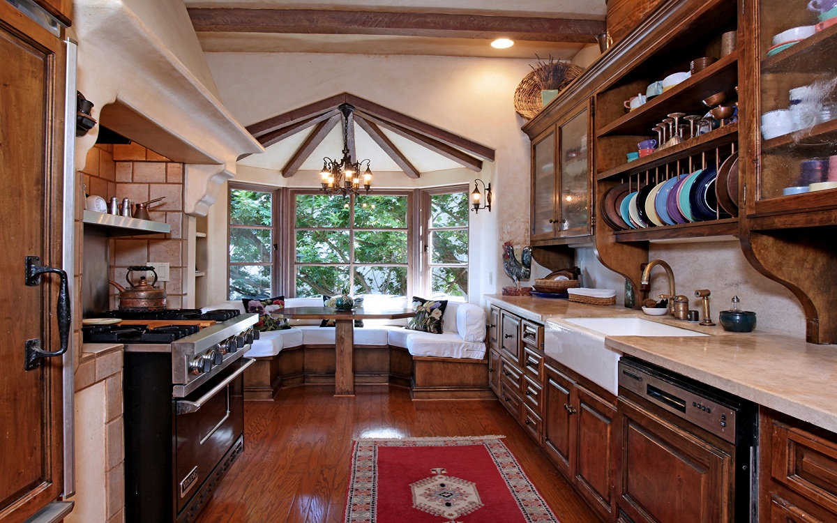Безворсовые ковры больше напоминают ткань с плотным и иногда грубоватым плетением. Это могут быть двухсторонние паласы, циновки из растительных материалов или синтетики, а также ковры «килим» и «сумах». Такие коврики как раз подойдут для оформления рабочей зоны – возле раковины или вдоль гарнитура. Правда, с циновками из плетёного сизаля, бамбука, джута, льна и пр. нужно быть осторожнее, так как они боятся влаги. Впрочем, остальные кухонные загрязнения они переносят отлично, если имеют плотное и гладкое плетение.