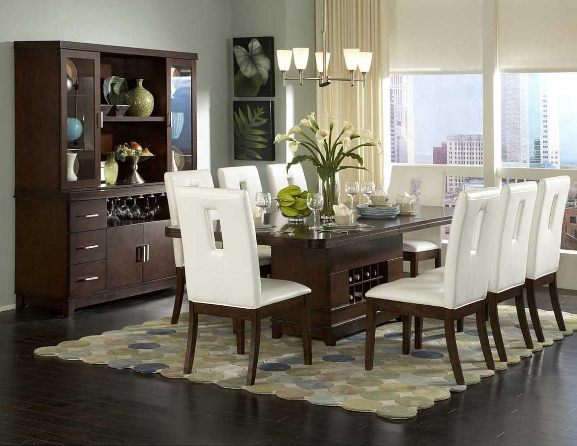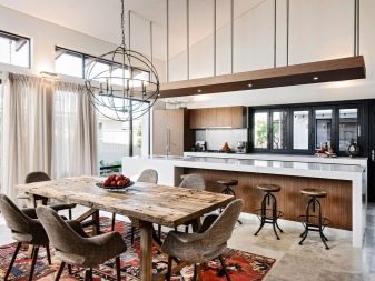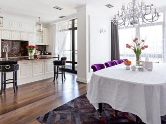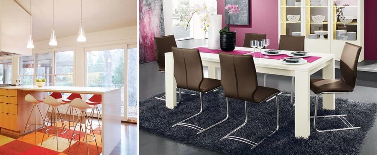В обеденной зоне, в отличие от рабочей, лучше размещать большие ковры на пол. На них удобнее выдвигать и задвигать стулья. Но здесь тоже стоит помнить несколько моментов.