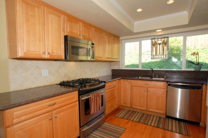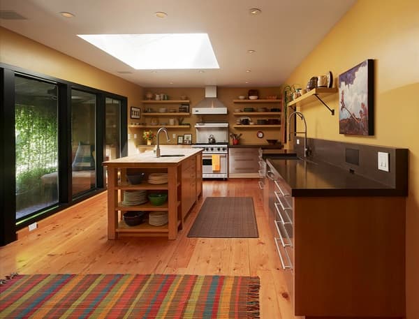 Небольшой коврик в зоне у раковины. Такое решение не только будет красиво выглядеть, но и может оказаться полезным для здоровья. Все дело в том, что на поверхность пола на кухни часто попадает вода, и иногда, не замечая того, хозяйка продолжительное время стоит на мокром полу.