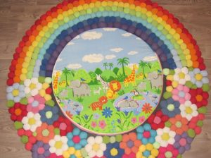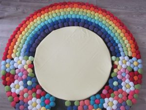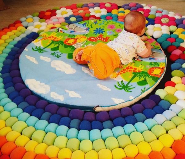 Развивающий коврик из мягких трикотажных помпонов – более сложное изделие, но для детской комнаты он просто незаменим, ведь на него можно укладывать даже малышей.