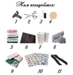 1.Пистолет с термоклеем 2. Портновские ножницы 3. Прочная нить и игла с большим ушком 4. Картонный шаблон-выкройка 5. Старые футболки или трикотажная ткань разных цветов 6. Плотная ткань или нетканое полотно 7. Мебельный поролон 8. Синтепон 9. Клеёнка для матрасика 10. Яркая ткань для чехла на матрас 11. Молния для наматрасника |