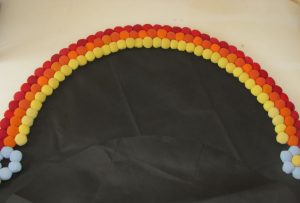 Из плотной ткани выкраивают основу коврика в виде круга диаметром 1,5-1,6 м. Помпоны клеят к основе с помощью термоклеевого пистолета, соблюдая выбранный рисунок, в данном случае – радугу. |