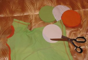 Из картона вырезают круглый шаблон-выкройку диаметром 12-15 см. По ней обводят и выкраивают из разноцветного трикотажа заготовки для помпонов. Их количество и цвета зависят от вашей фантазии. |
