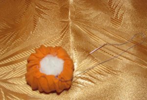 Формируют помпоны из ткани и наполнителя, окончательно стягивают и зашивают края. |