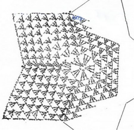 1 ряд. 3 в.п. подъема, 2 ст. с/н. над 1-й в.п. предыдущего ряда, 2 в.п., * 3 ст. с/н., 2 в.п. Провязать от * до * 5 раз для формирования пятиугольника.