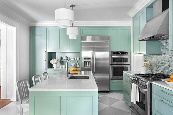 Любите «полосатые» интерьеры? Смотрите фото ниже. Бело-голубые полы уравновешивают белый кухонный гарнитур и голубой рабочий фартук.