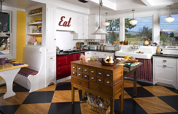 Можно даже имитировать большую каменную плитку, разрисовав полы вот такими серыми квадратами (фото ниже). Эти цвета повторяются не только на бытовой технике, но мозаичном рабочем фартуке.
