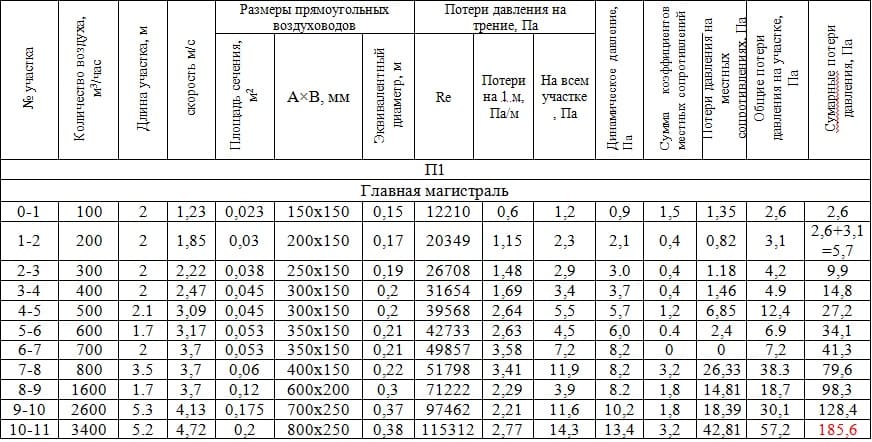 - Находим суму потерь давления на каждом участке = 1.35+1.2=2,6 Па. А в итоге и потери давления во всей магистрали = 185,6 Па. таблица к тому времени будет иметь вид