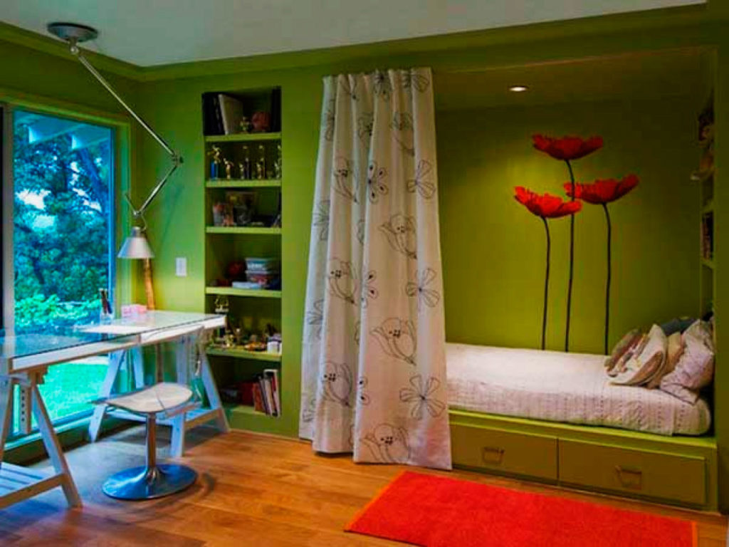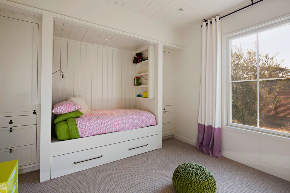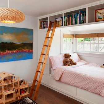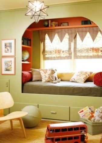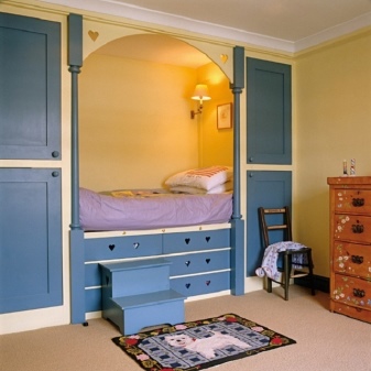 Если речь идет о нише в детской комнате, то вам следует позаботиться о том, чтобы кровать имела дополнительные бельевые ящики и системы хранения, в которых вы сможете разместить не только белье и одежду, но и игрушки и книжки. Оригинально будет выглядеть конструкция со стеной, представляющей собой одно большое полотно для рисования. Также для ниши в детской спальне можно подобрать красивые фотообои с героями мультфильмов или животными. Не рекомендуется покупать чересчур яркие материалы для отделки, так как они будут мешать быстрому засыпанию ребенка.
