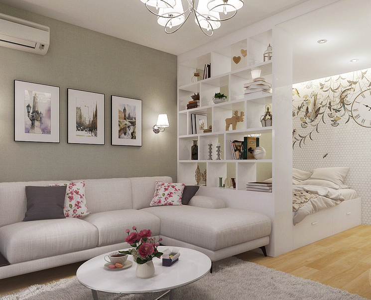 И это главный аргумент тех, кто боится ставить кровать в однушке или студии. Конечно, вряд ли в совсем маленькой квартире площадью 17-20 квадратов есть место кровати — это абсолютно нерациональная трата метров, но и в полноценной однушке от 30 м2 все равно многие хотят обустроить полноценную гостиную зону.