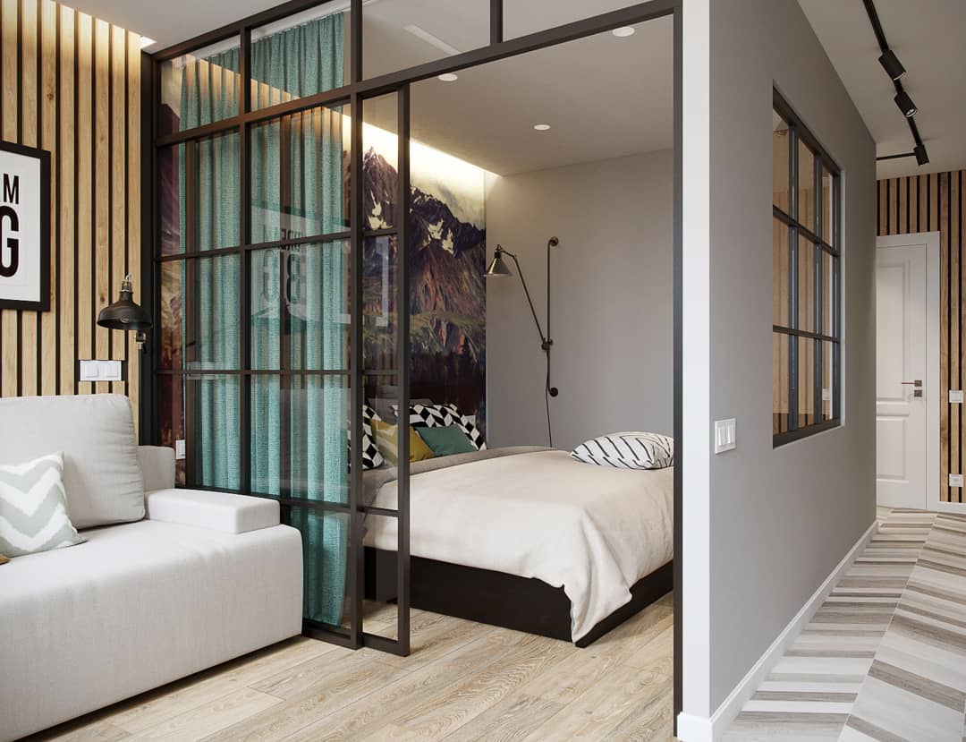 Это самый простой способ отделить спальню от второй зоны. Если в квартире живет молодая семейная пара или один человек, это может быть даже прозрачный тюль — условное зонирование. Но плотная штора может защитить от света — звуки конечно останутся и могут мешать отдыху.