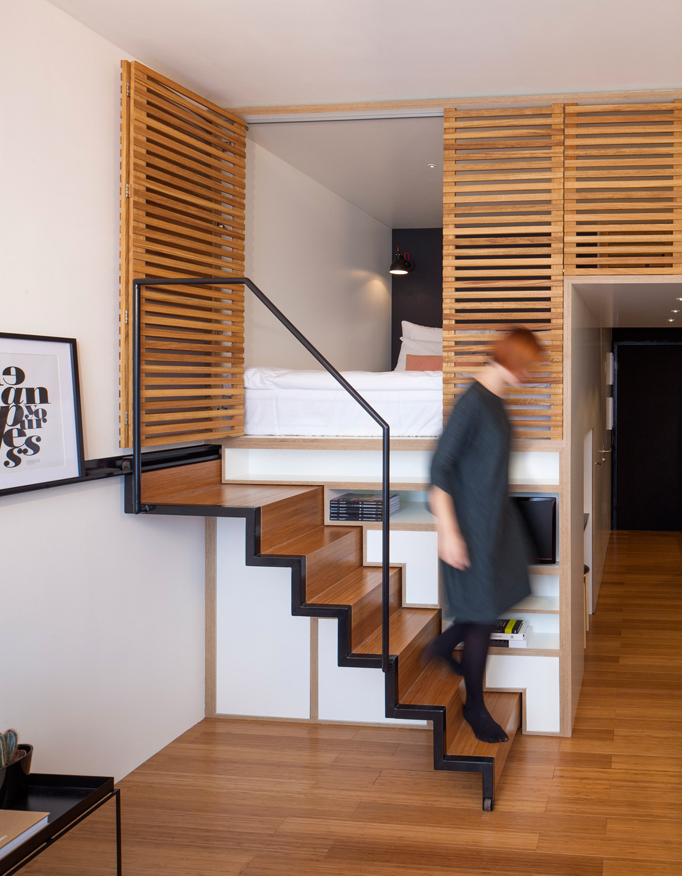 Поднимите уровень пола и разместите кровать на подиуме. Внутри подиума можно монтировать дополнительные системы хранения.