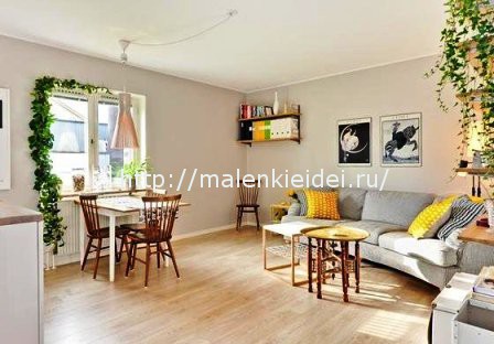 Как и в большинстве вариантов малогабаритных квартир – студий прослеживается концепция минимализма. Только самые необходимые предметы мебели: обеденный стол, изящные стулья, серый диван – трансформер. Яркие желтые подушки, сочная зелень, обрамляющая оконный проем, добавляют нотки весенней свежести.