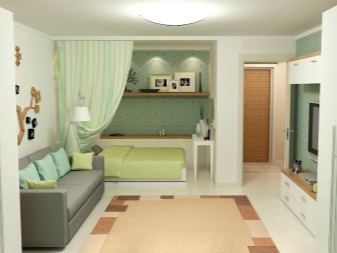 Каждый отделочный элемент может комбинироваться с другим, главное – правильно подобрать цветовую гамму. Чтобы интерьер однокомнатной квартиры с углублением в стенке приносил эстетическое удовольствие владельцам и гостям дома, дизайнеры рекомендуют использовать варианты отделки ярких тонов. Специалисты аргументируют свои рекомендации тем, что темный фон ниши создаст эффект «черной дыры» или пустоты, на светлом фоне не удастся донести креативную идею, а вот яркие краски – идеальные спутники подобного варианта обстановки.