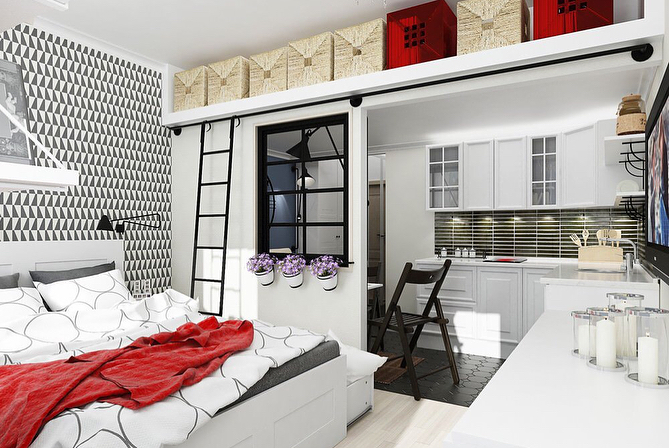Кровать-чердак в квартире-студии как способ повышения функциональности интерьера