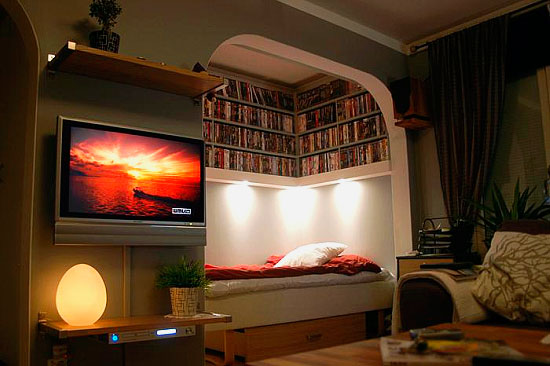 Актуальна такая мебель не только в однокомнатной квартире, но и в модной студии. Сегодня подобные планировки, в которых отсутствуют перекрытия, очень популярны. Чаще всего такие квартиры имеют небольшую площадь, и многие хозяева сталкиваются с проблемой расположения всех необходимых предметов интерьера на имеющемся пространстве. Кровать в нише не только займет минимум свободного места, но и позволит произвести зонирование спальной зоны.