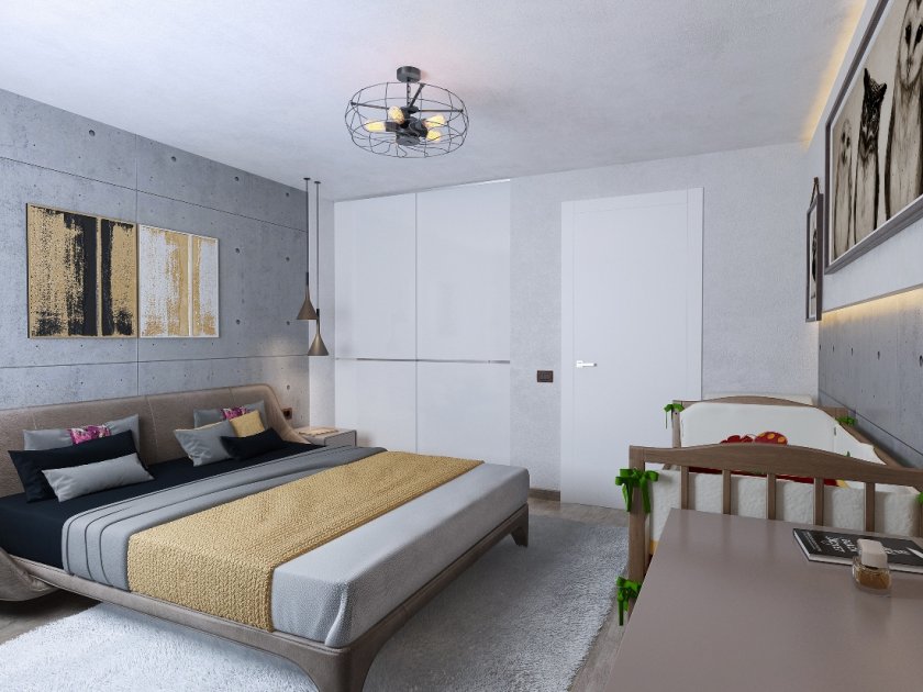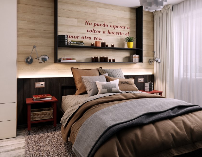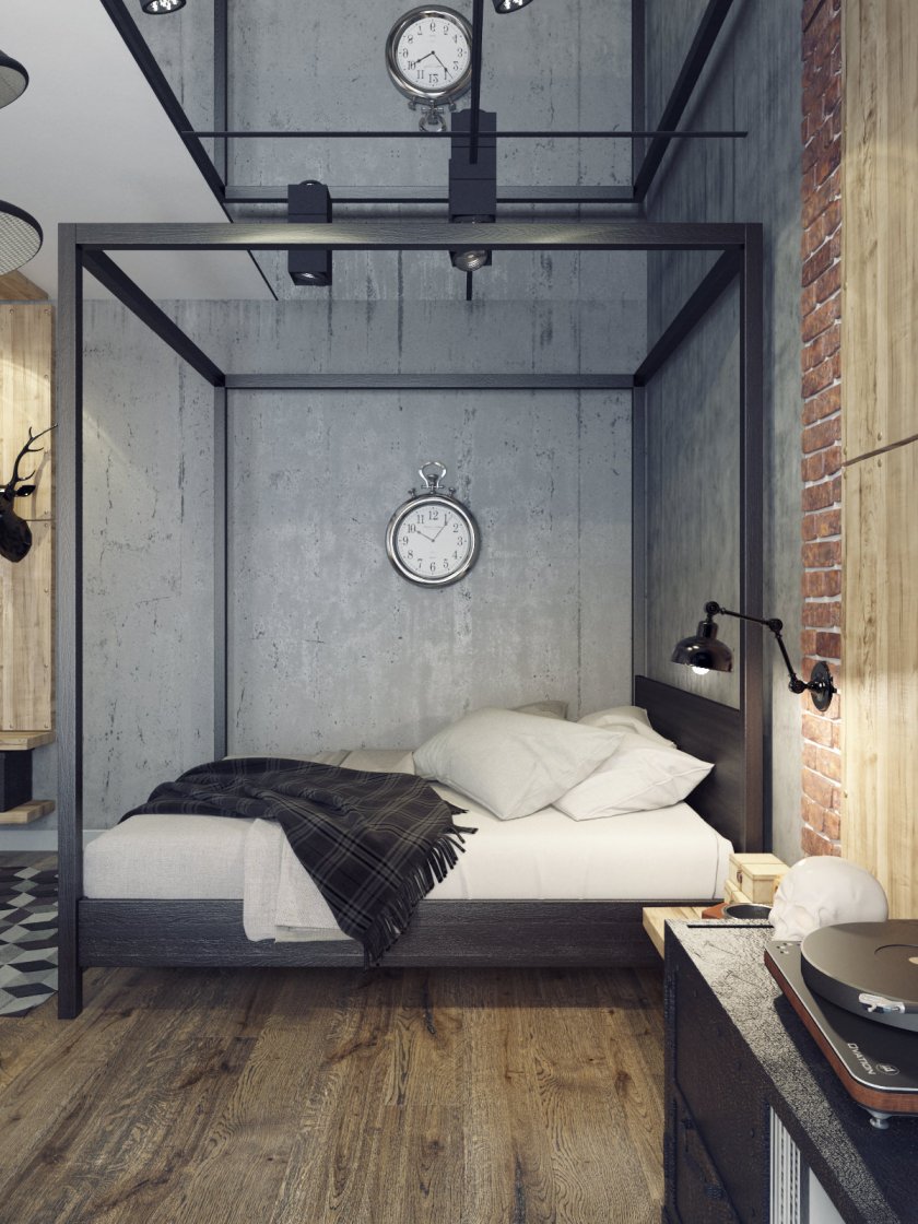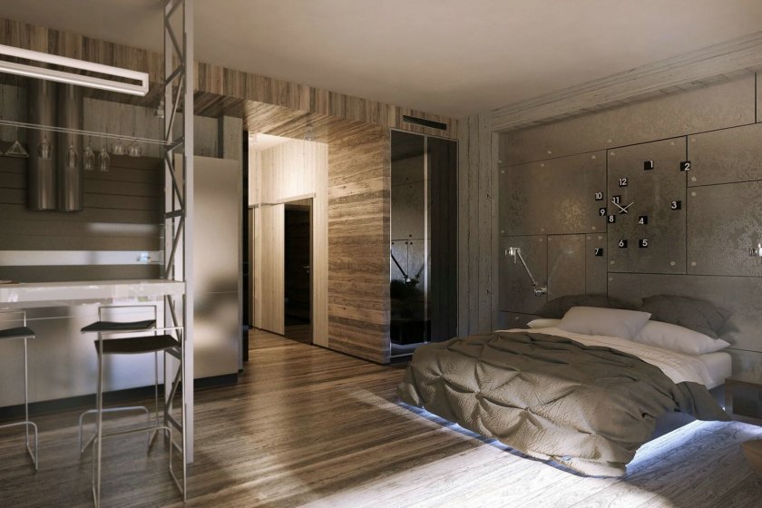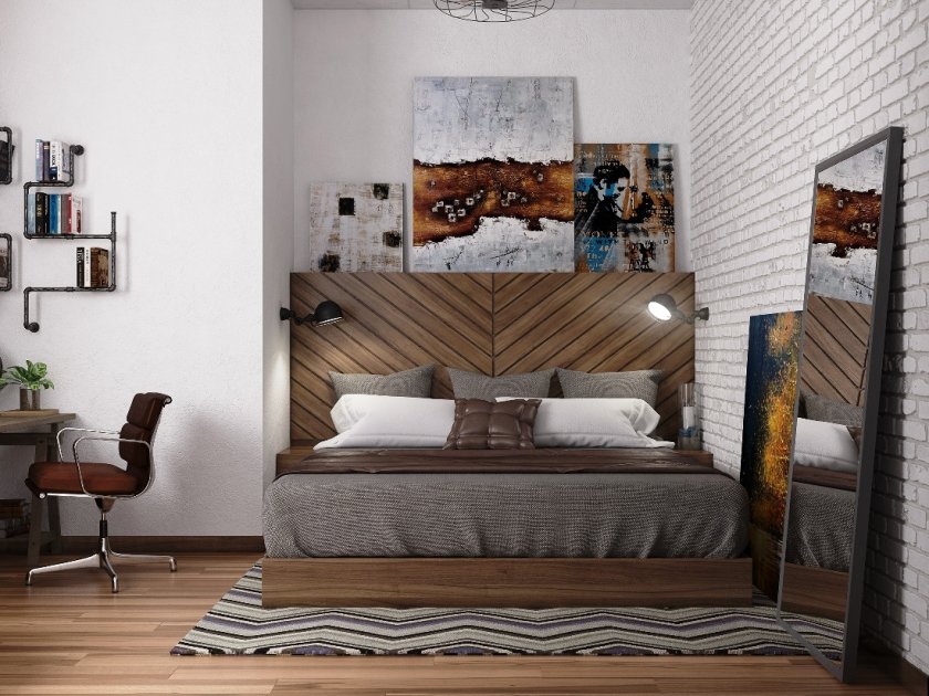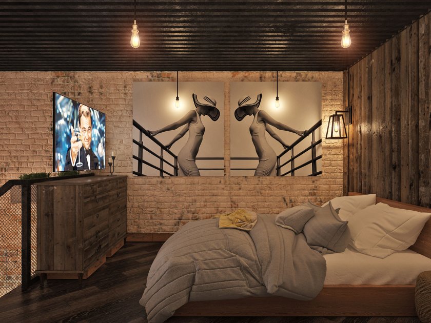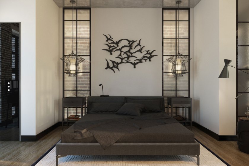 Необходимо начать с обустройства зоны спальни. Хорошо повесить стилизованные детали интерьера, часы, поместить лампы по бокам от ложа. Лампы хорошо смотрятся промышленные или для черчения, как на старых объектах. Они создают уникальную атмосферу. Заправлять кровать можно не только покрывалом, но и добавлять другие элементы в вышеперечисленных тонах. Белье должно быть однотонным.