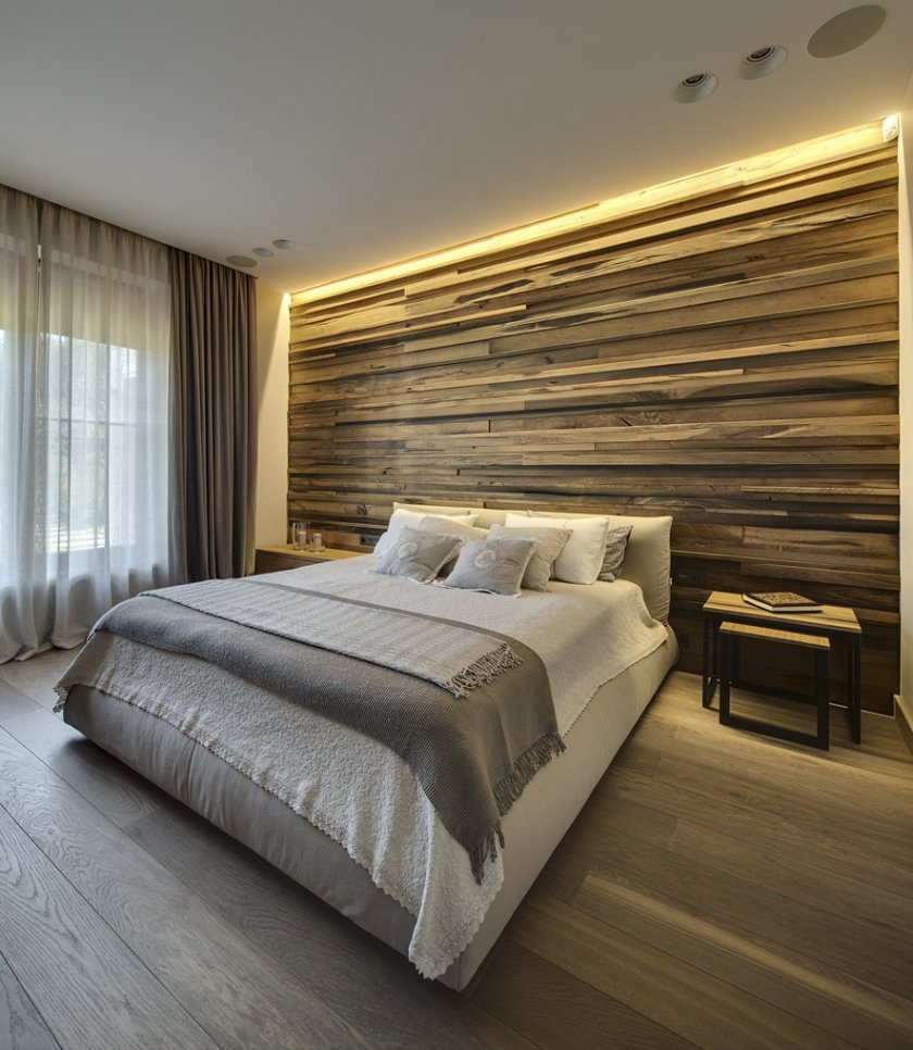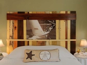 Вертикальные рейки разной или одинаковой высоты, разной или одинаковой породы деревьев, сбитые в единое полотно или с зазорами – это только ваше индивидуальное украшение спального места. Из таких же реек или цельного куска древесины можно сделать рамки для фотографий. Часто над такой кроватью вешают черно-белые фото, но это необязательно.