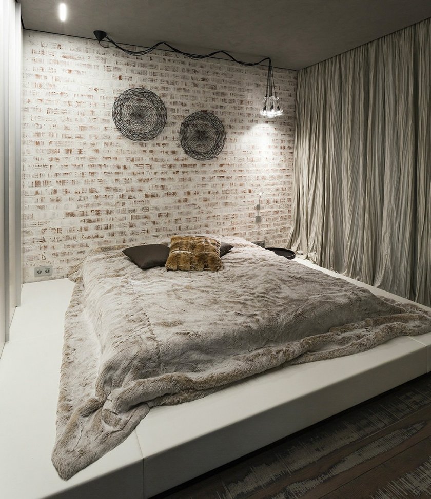 Естественным изголовьем может быть необработанная кирпичная стена или грубо отделанная камнем. Для намека на стиль достаточно одной такой стены.