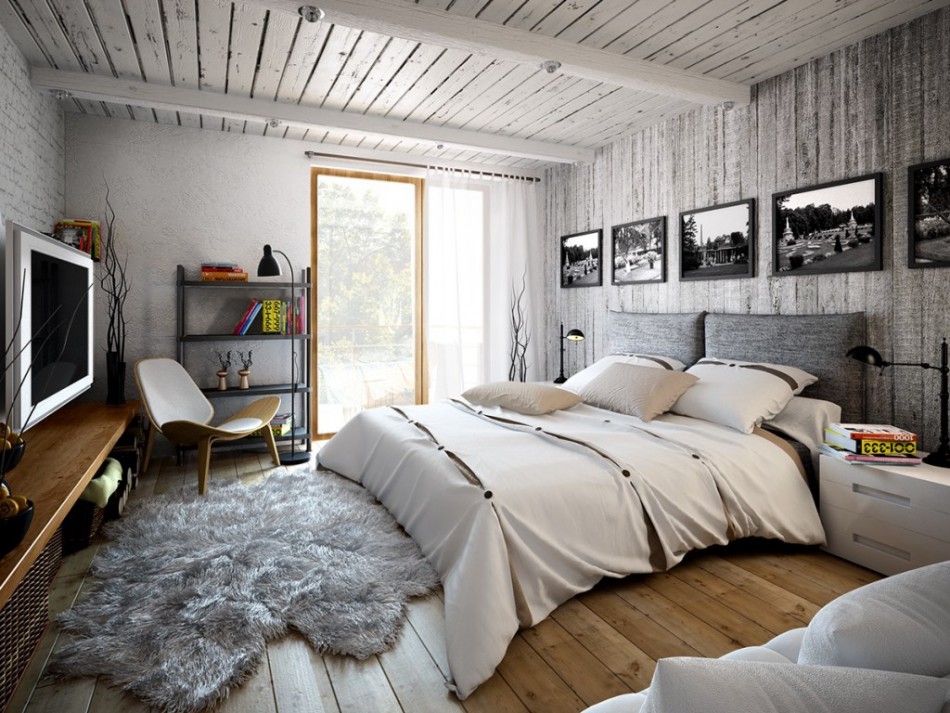 Шикарно выглядит симбиоз стилей лофт и минимализм. Им присущ дизайн без лишних элементов и безделушек, только функциональность, только строгость, но вместе с этим расположение спальни на территории с большой площадью.