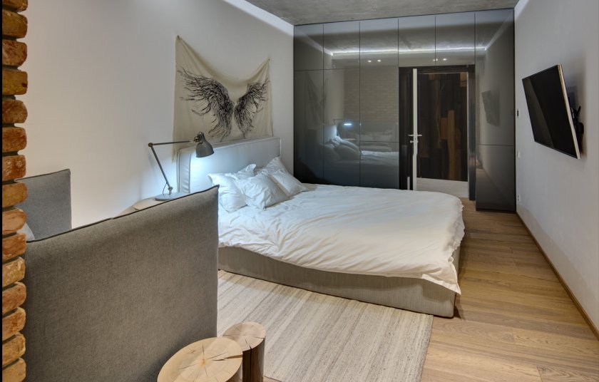 Хозяин лофт-спальни, дополняя интерьер редкими уникальными вещами, умеет окружить себя модной роскошью. Кожаный саквояж, резная тумбочка ручной работы подчеркивают статус обладателя такого интерьера, являются свидетельством его успешности, изысканности и вкуса.