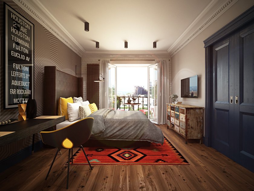 Четвертая – удобство и комфорт. Этот стиль допустит любую постановку кровати: на сплошной деревянной основе, на металлическом каркасе, на подвесной люльке, главное, чтобы матрас был удобен, свет освещал нужное пространство, а у кровати лежал мягкий ковер.