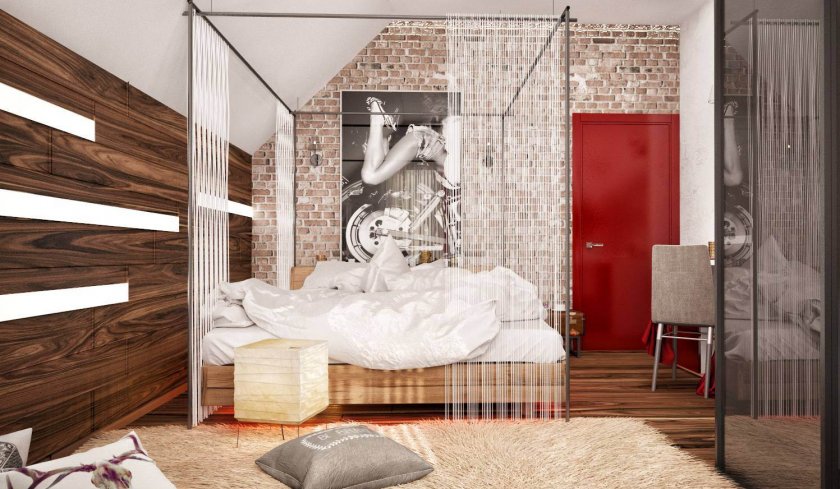 Спальное место в комнате, выполненной в интерьере Лофт, можно расположить в нише одной из стен, на небольшом возвышении (при многоуровневой организации пола), в центре комнаты (центральный элемент планировки) либо на чердаке.