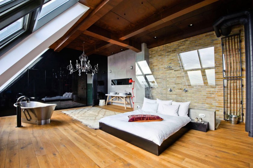 Такой дизайн не предполагает вообще никакого разделения на зоны и комнаты с помощью перегородок, здесь все на виду: не только спальня, но и ванная, и даже туалет. Чтобы понять, что именно имеется ввиду, когда говорится о брутальности, можно представить себе мастерскую художника века, скажем, XIX.