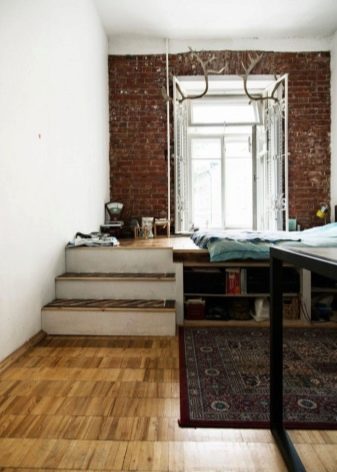 Или, скажем, импровизированный чердак – такой вариант подходит для больших помещений, объединенных в одно целое пространство, здесь просто необходимо уединение. В этом случае под кроватью может разместиться гардеробная или мини-кабинет.
