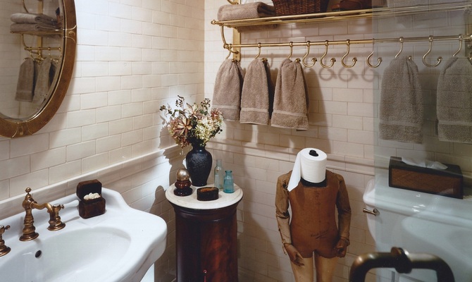 В частной усадьбе или современной квартире свободной планировки ванная комната может иметь большие размеры. Здесь можно использовать и крючки, и специальные полотенцедержатели, и даже вешалки для ванной в виде манекена. На него можно накинуть халат и повесить одежду.