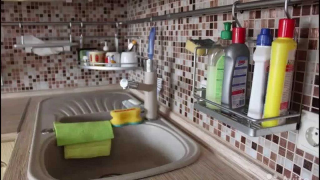 В небольших по площади кухнях уместно использовать системы хранения с множеством ярусов. Закрепляются они в основном на расстоянии приблизительно 8-10 см под навесными шкафами. К трубе специальными крючками прикрепляются различные детали: