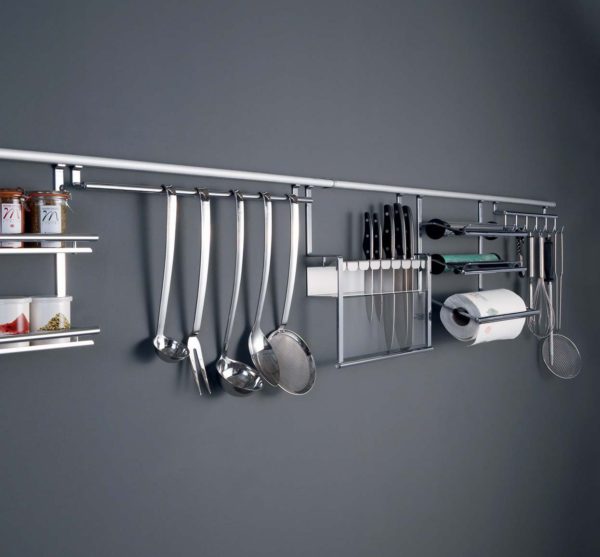 Комплектуются рейлинги для кухни держателями разнообразной формы. Держатели предназначены, для того чтобы хранить, к примеру, фольгу, полотенца. Можно использовать их для ножей, навесной хлебницы, продуктов питания, подставок. В целом все эти аксессуары одного типа. Продукция разных производителей незначительно различается конструкцией, предназначением и цветом.