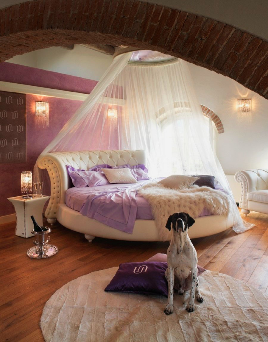 А вот для владельцев просторных спален это очень удачное решение, позволяющее создать неповторимую атмосферу уюта, спокойствия и роскоши. Дополнительный балдахин, мебель округлой формы отлично дополнят интерьер.