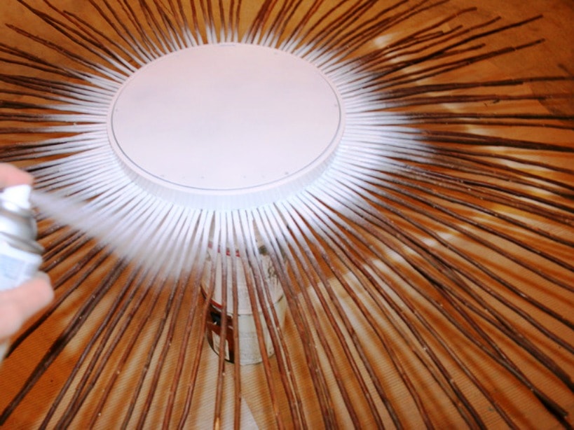 Покрываем ветки спрей-краской нужного оттенка и оставляем высыхать. Только после этого убираем бумагу с зеркала. Прикрепляем к задней поверхности петлю, чтобы подвешивать его на стену.