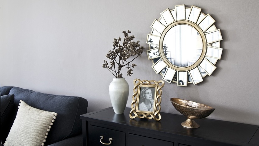 Круглое зеркало в раме украшает комнату и привносит в интерьер оригинальность. Издавна считалось, что зеркало круглой формы оберегает дом от негативной энергии и дарит чувство спокойствия.