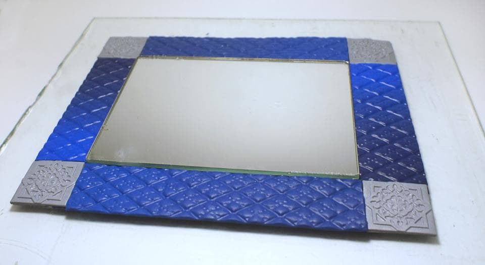 Ждем, пока остынет задняя стенка рамы и кладем ее рисунком вниз. В центральной части размещаем зеркало. Аккуратно смазываем жидкой пластикой рамку.