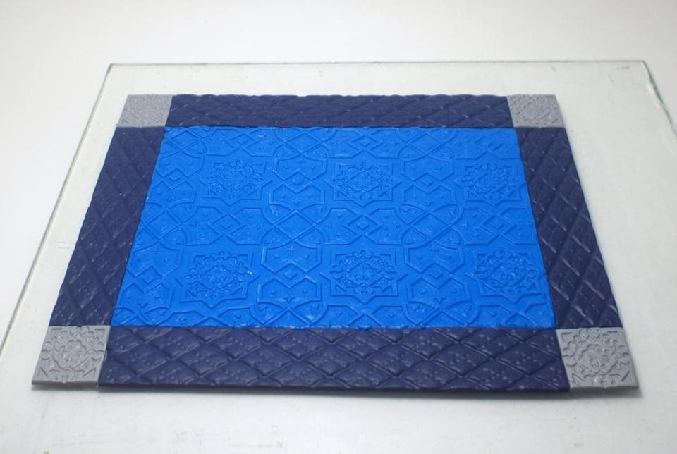Целый пласт раскатанной полимерной глины понадобится для создания основания рамки. На рабочей поверхности раскатываем его таким образом, чтобы края выходили за границы зеркала на несколько сантиметров с каждой стороны.