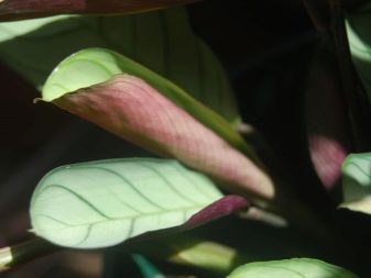 Листовые пластинки продолговатой формы до 40 см длиной, бархатистые со светло-зелеными и серебристо-кремовыми полосами. Раскраска листа несимметричная, его изнанка пурпурная.