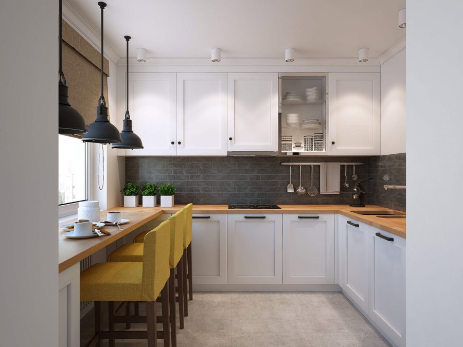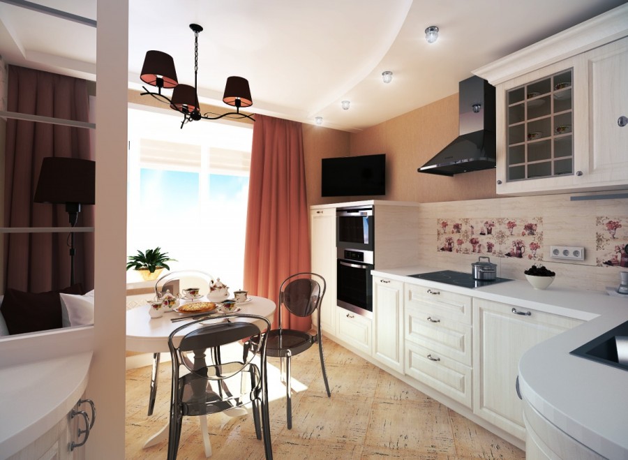 Мебель для экономии пространства лучше подбирать трансформирующуюся. Складной стол и стулья в обеденной зоне будет очень удачным решением в этом небольшом пространстве. Кухонная зона должна быть оборудована необходимой встроенной техникой: небольшая духовка, узкая посудомоечная машина, компактная варочная панель и обязательно хорошая вытяжка. Вместо стола и стульев можно использовать барную стойку складной конструкции и высокие табуреты.