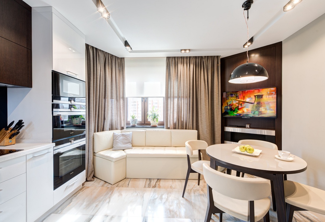 Продольное деление комнаты предполагает размещение кухонного гарнитура вдоль стены Г-образным или линейным способом. Диван и журнальный столик располагаются на противоположной стороне. Обеденная зона размещается по центру. Телевизор в таком случае вешается на стену над рабочим местом, часть верхних ящиков в данном случае отсутствует. Вместо стационарного обеденного стола при Г-образной планировке можно использовать барную стойку.